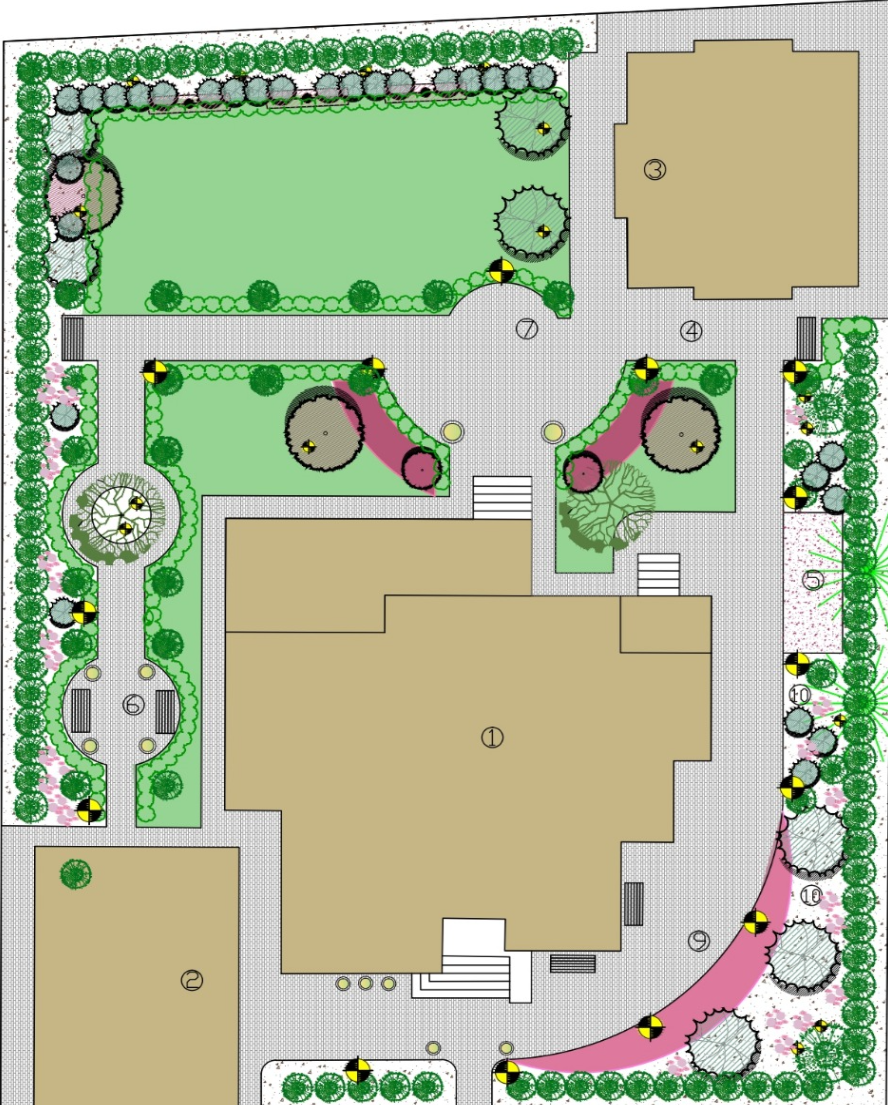 Обязательный минимум: генеральный план, план мощений, разбивочный чертеж дорожек и площадок, баланс территорий и объемы благоустройства участка, дендроплан, посадочный чертеж, ведомости озеленения.